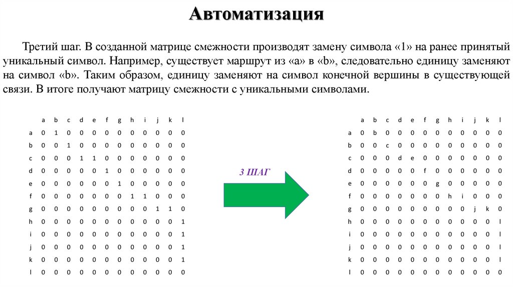 АвтоматизацияТретий шаг. В созданной матрице смежности производят замену символа «1» на ранее принятый