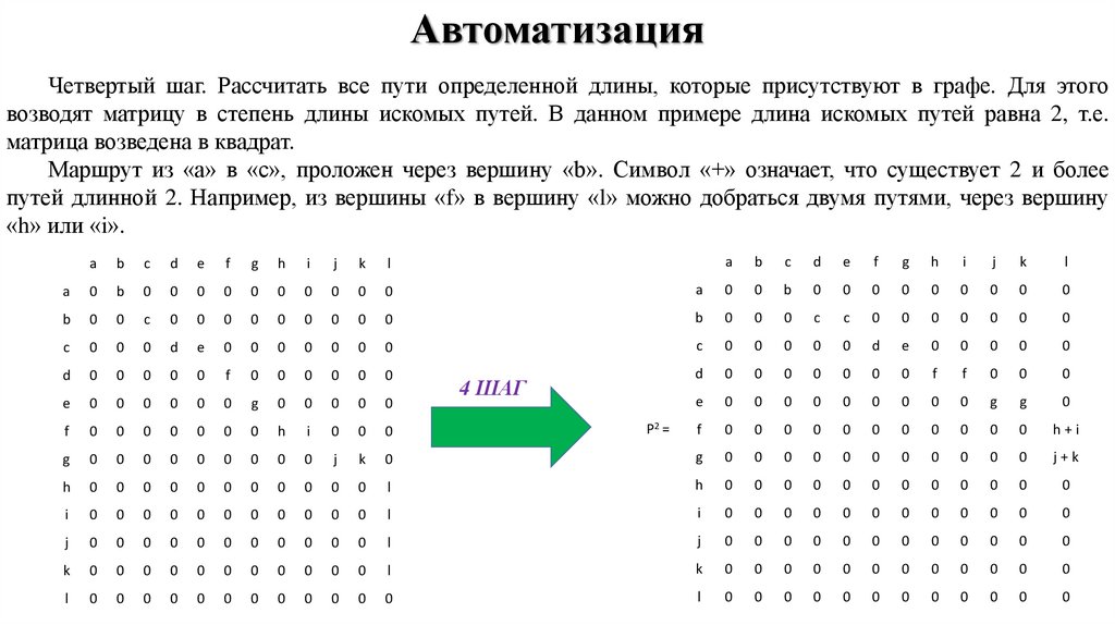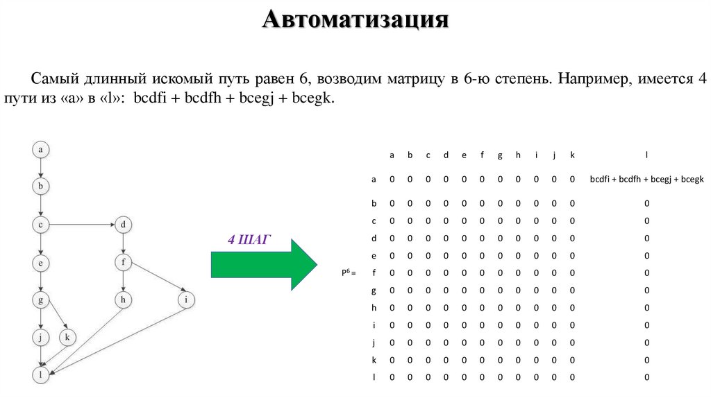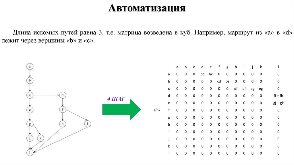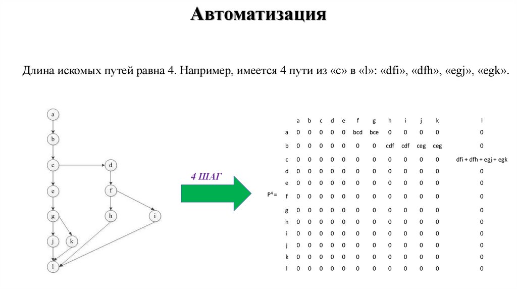 АвтоматизацияДлина искомых путей равна 4. Например, имеется 4 пути из «c» в «l»: «dfi», «dfh», «egj», «egk».