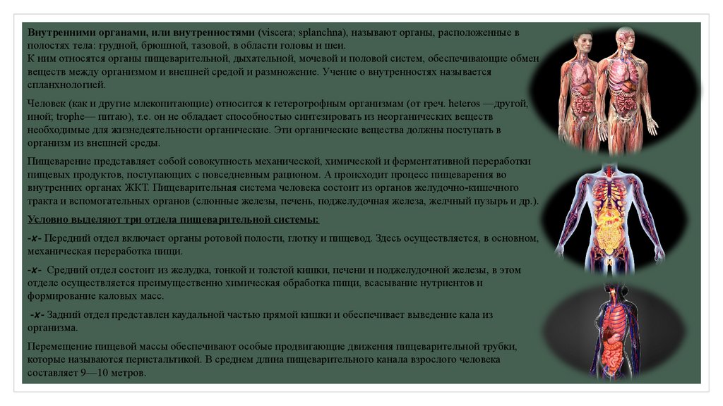 Внутренними органами, или внутренностями (viscera; splanchna), называют органы, расположенные вполостях тела: грудной, брюшной, тазовой, в области головы и шеи.
