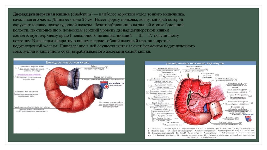 Двенадцатиперстная кишка (duadenum) — наиболее короткий отдел тонкого кишечника,начальная его часть. Длина ее около 25 см. Имеет форму подковы, вогнутый край которой