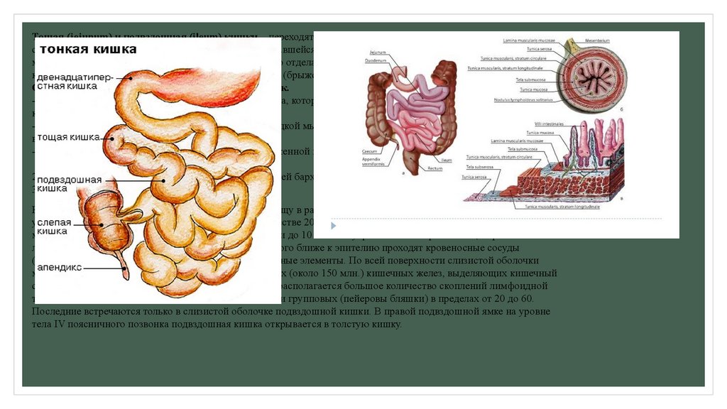 тощая и подвздошная), толстая кишка и её отделы (слепая кишка и аппендикс,
