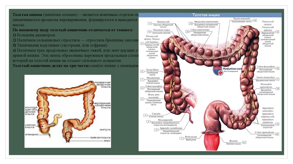 Толстая кишка (intestium crassum) —является конечным отделом пищеварительного канала. В нейзаканчиваются процессы переваривания, формируются и выводятся через задний проход наружу каловые