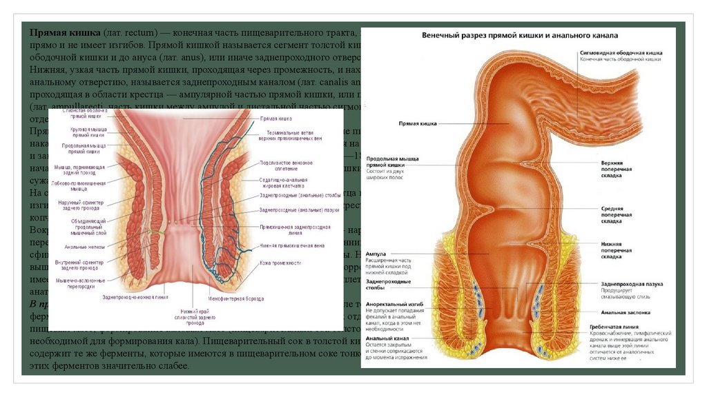 Прямая кишка представляет концевой отдел толстой кишки и окончание пищеварительного тракта. В ней