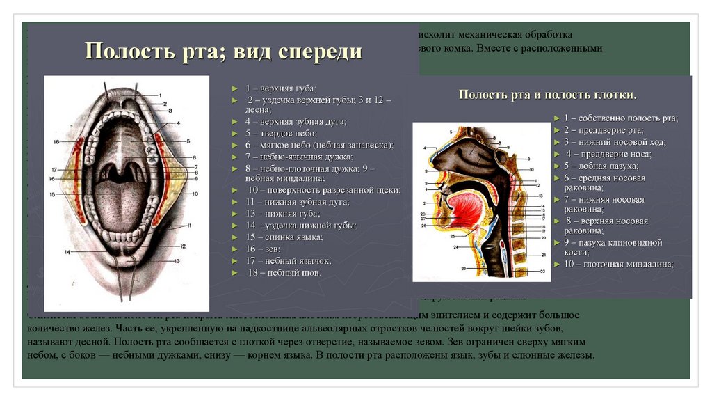 Полость рта (cavitas oris) – начальный отдел пищеварительного тракта. В ней происходит механическая обработкапищи, начало химической обработки под воздействием слюны формирование пищевого комка. Вместе с расположенными