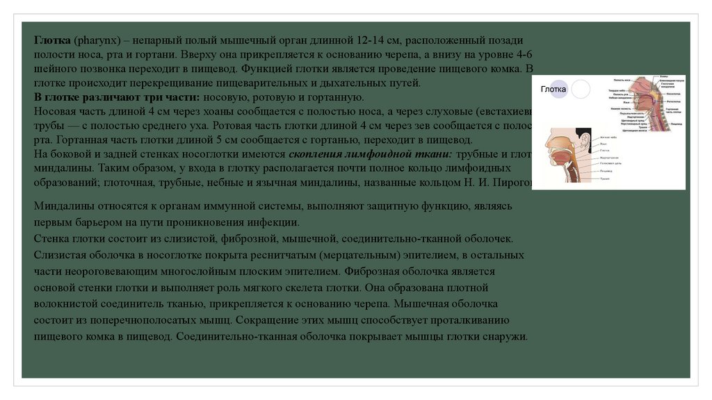 называют десной. Полость рта сообщается с глоткой через отверстие, называемое зевом. Зев ограничен сверху мягким