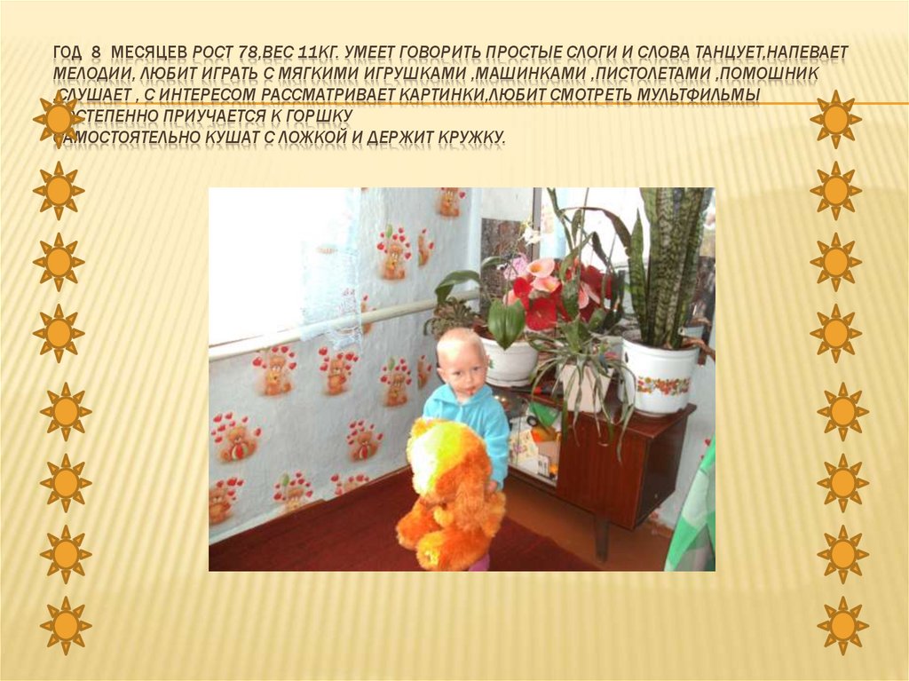 ГОД 8 МЕСЯЦЕВ РОСТ 78,ВЕС 11КГ. УМЕЕТ ГОВОРИТЬ ПРОСТЫЕ СЛОГИ И СЛОВА ТАНЦУЕТ,НАПЕВАЕТМЕЛОДИИ, ЛЮБИТ ИГРАТЬ С МЯГКИМИ ИГРУШКАМИ ,МАШИНКАМИ ,ПИСТОЛЕТАМИ ,ПОМОШНИК