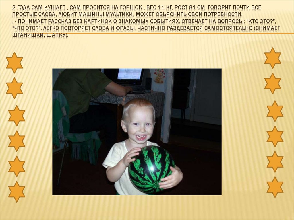 2 ГОДА САМ КУШАЕТ , САМ ПРОСИТСЯ НА ГОРШОК , ВЕС 11 КГ, РОСТ 81 СМ. ГОВОРИТ ПОЧТИ ВСЕПРОСТЫЕ СЛОВА, ЛЮБИТ МАШИНЫ,МУЛЬТИКИ, МОЖЕТ ОБЬЯСНИТЬ СВОИ ПОТРЕБНОСТИ.