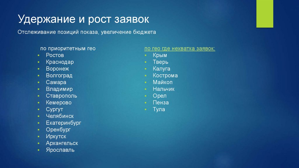 Удержание и рост заявокОтслеживание позиций показа, увеличение бюджета