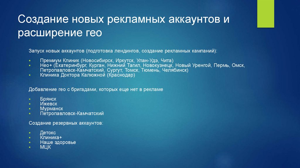 Запуск новых аккаунтов (подготовка лендингов, создание рекламных кампаний):