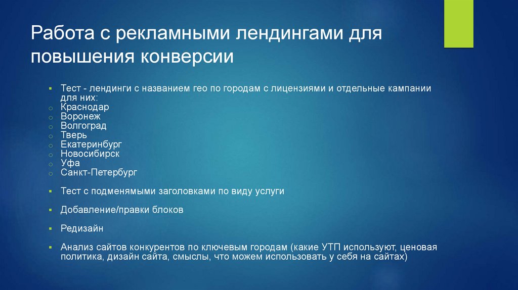 Тест - лендинги с названием гео по городам с лицензиями и отдельные кампании