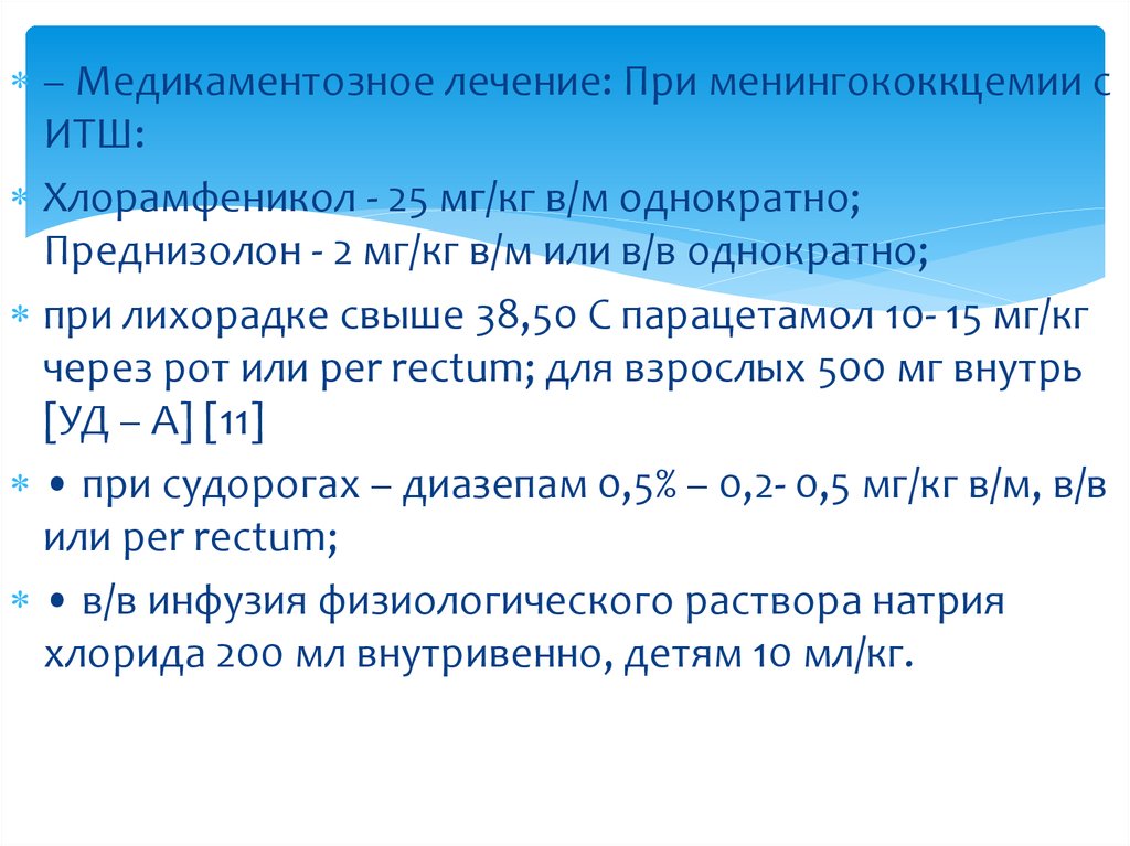 – Медикаментозное лечение: При менингококкцемии сИТШ: