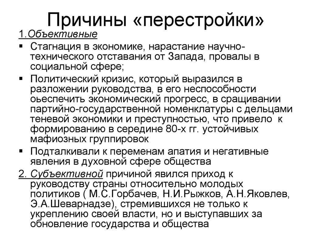 1.ОбъективныеСтагнация в экономике, нарастание научнотехнического отставания от Запада, провалы в