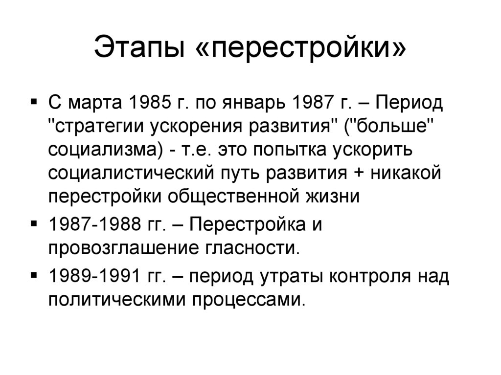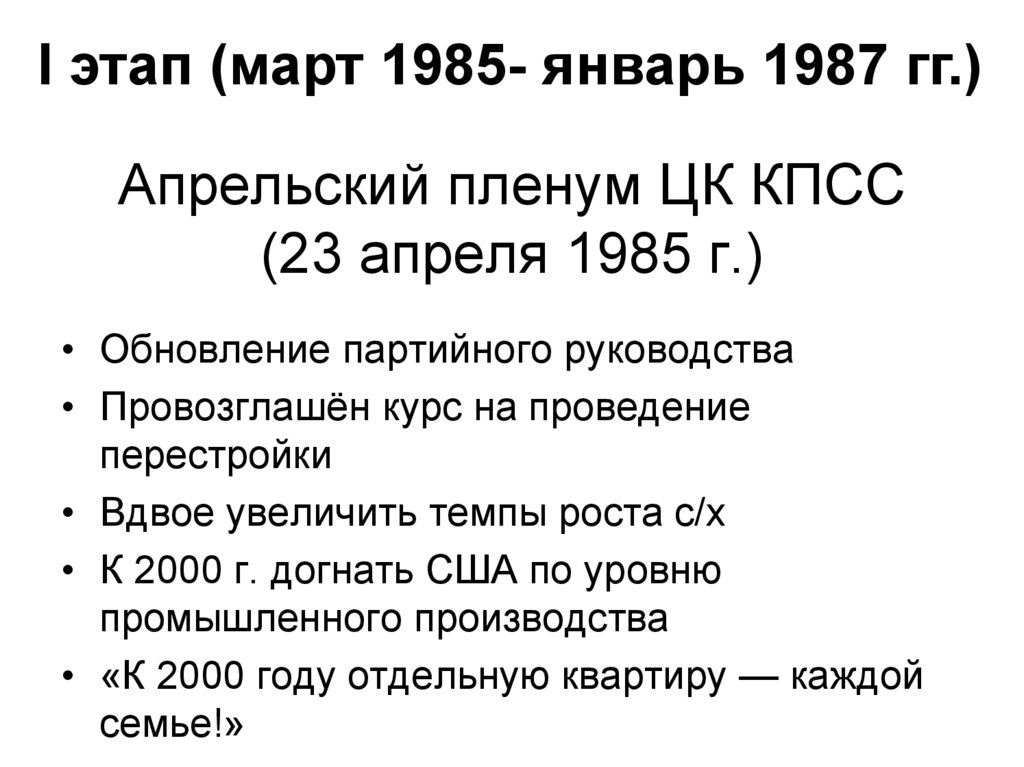 I этап (март 1985- январь 1987 гг.)Апрельский пленум ЦК КПСС