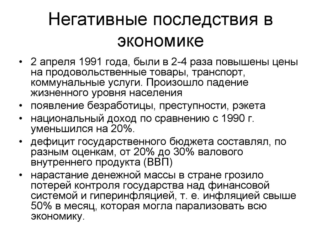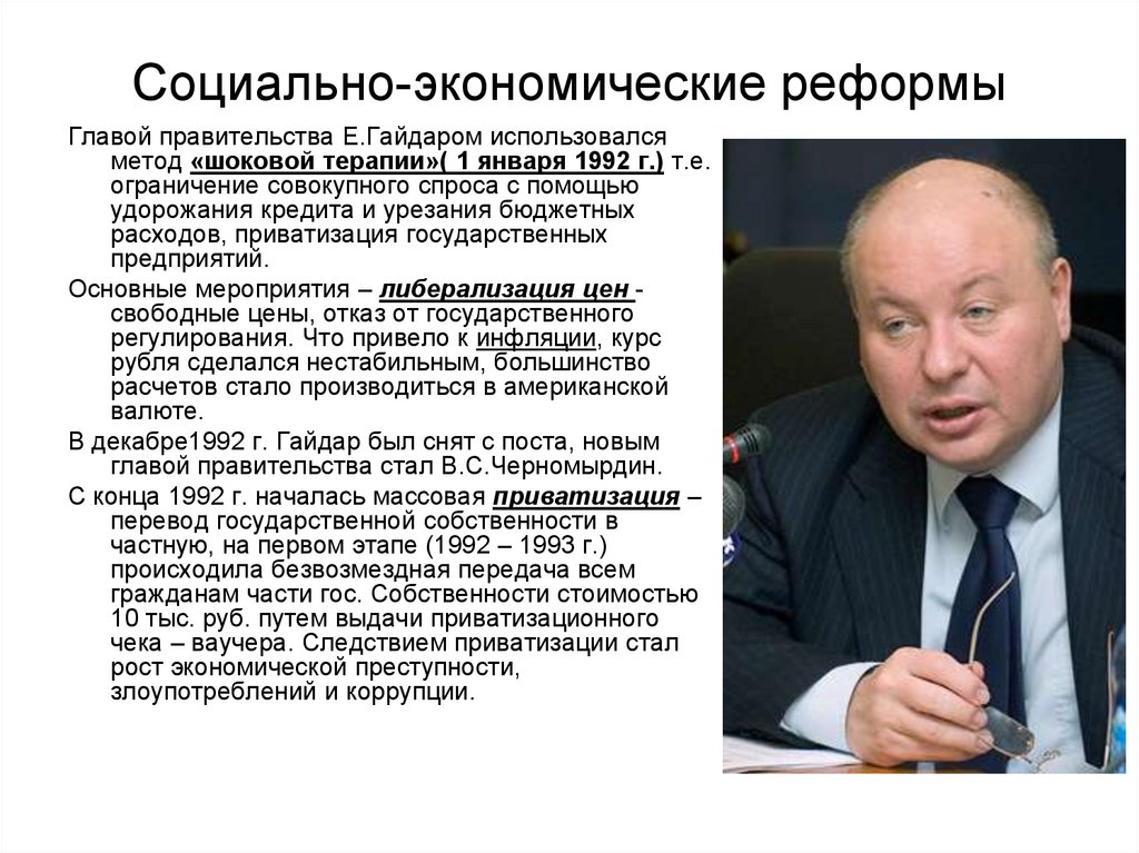 Главой правительства Е.Гайдаром использовалсяметод «шоковой терапии»( 1 января 1992 г.) т.е.