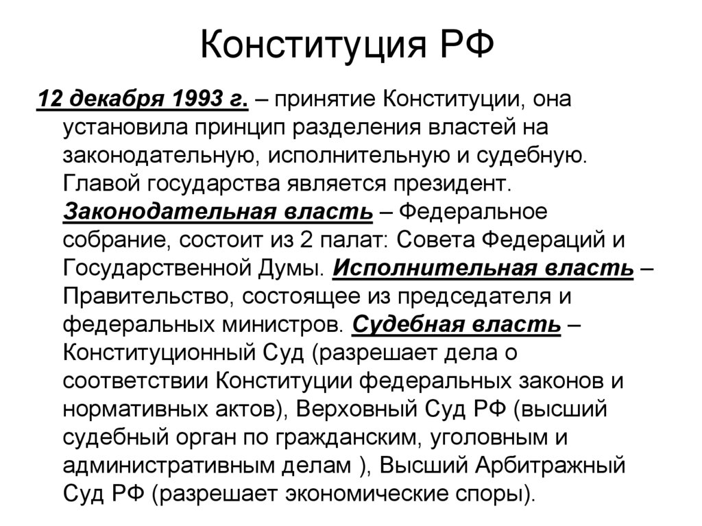 12 декабря 1993 г. – принятие Конституции, онаустановила принцип разделения властей на