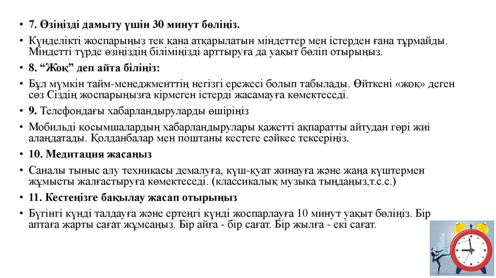 • 7. Өзіңізді дамыту үшін 30 минут бөліңіз.• Күнделікті жоспарыңыз тек қана атқарылатын міндеттер мен істерден ғана тұрмайды.