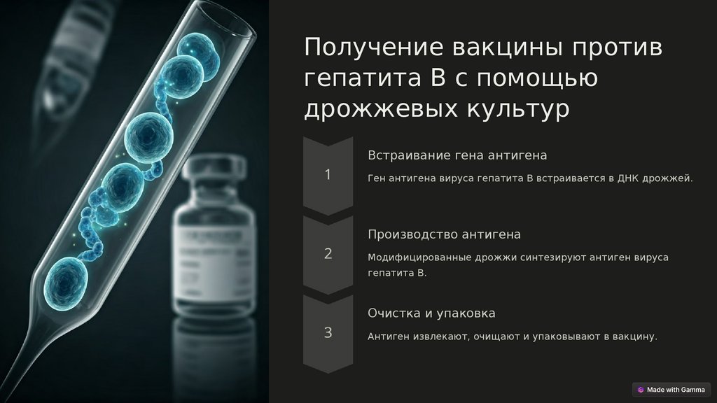 Ген антигена вируса гепатита B встраивается в ДНК дрожжей.