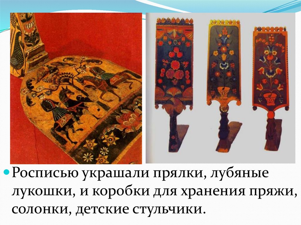Росписью украшали прялки, лубяныелукошки, и коробки для хранения пряжи,