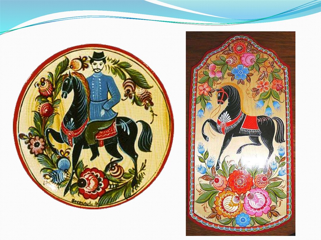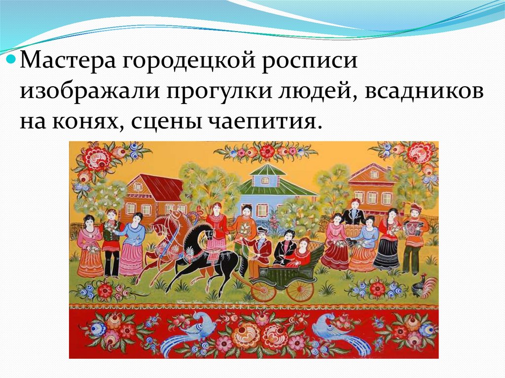 Мастера городецкой росписиизображали прогулки людей, всадников