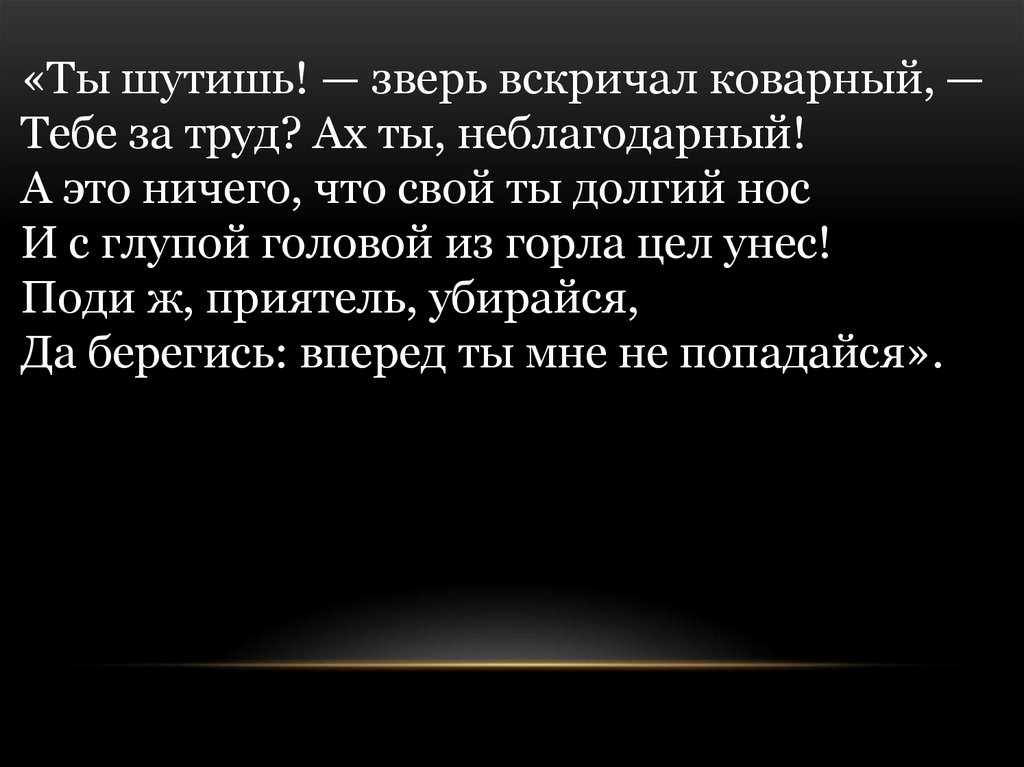 «Ты шутишь! — зверь вскричал коварный, —Тебе за труд? Ах ты, неблагодарный!