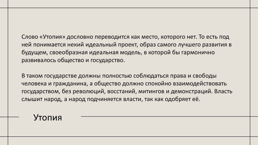 Слово «Утопия» дословно переводится как место, которого нет. То есть подней понимается некий идеальный проект, образ самого лучшего развития в