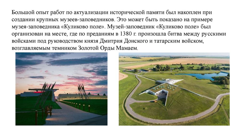 Большой опыт работ по актуализации исторической памяти был накоплен присоздании крупных музеев-заповедников. Это может быть показано на примере