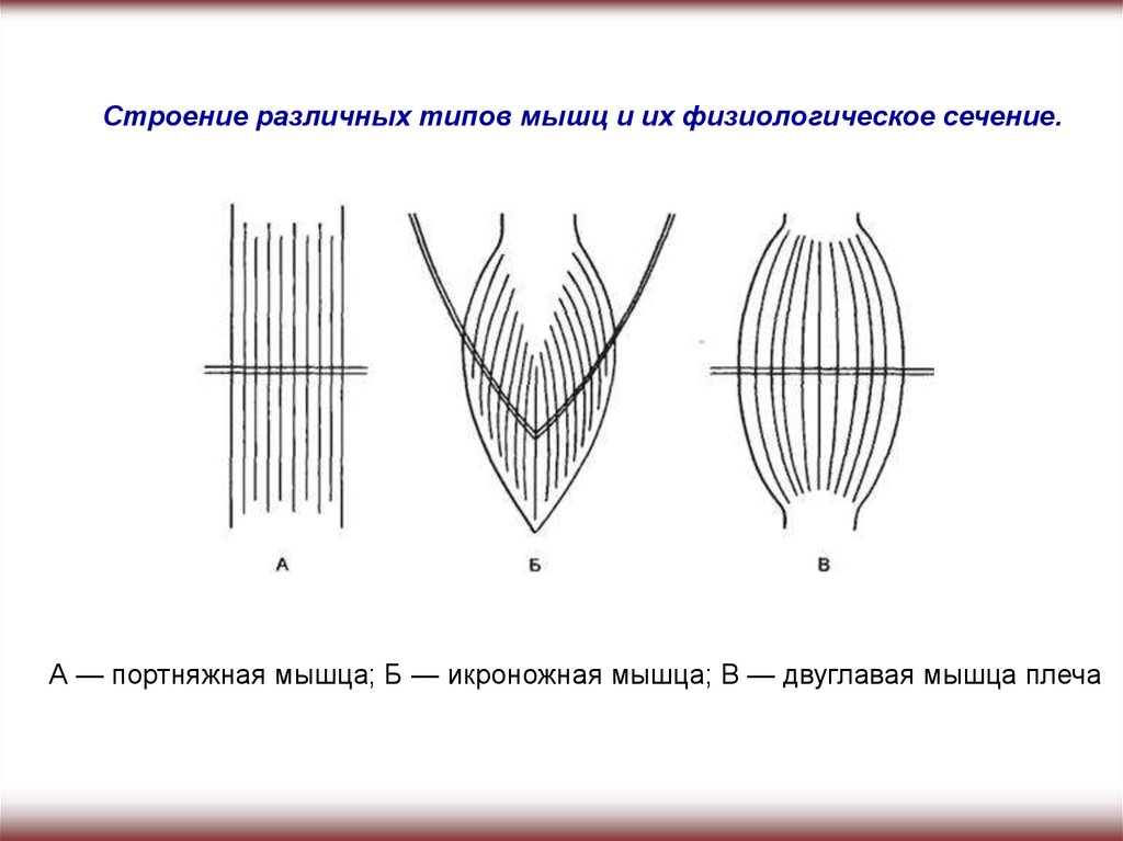 Строение различных типов мышц и их физиологическое сечение.А — портняжная мышца; Б — икроножная мышца; В — двуглавая мышца плеча