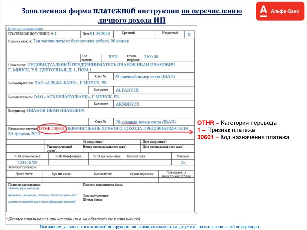 Заполненная форма платежной инструкции по перечислениюличного дохода ИП