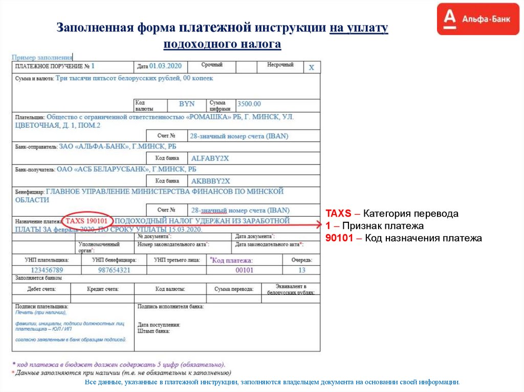 Заполненная форма платежной инструкции на уплатуподоходного налога