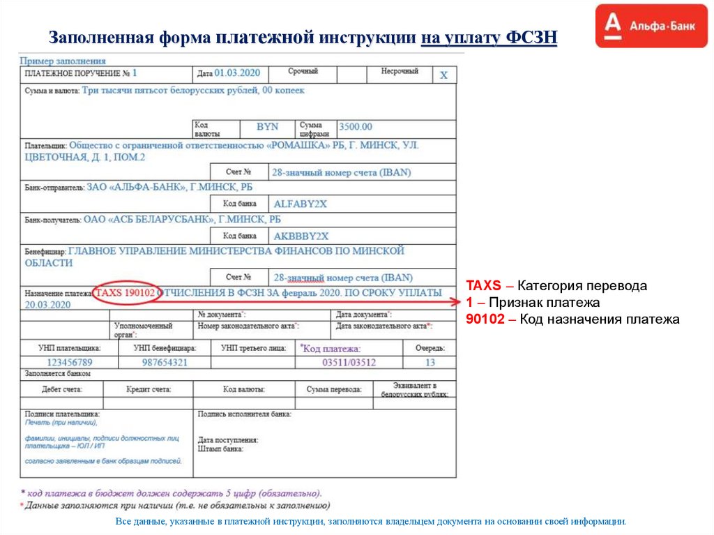 Заполненная форма платежной инструкции на уплату ФСЗНTAXS – Категория перевода