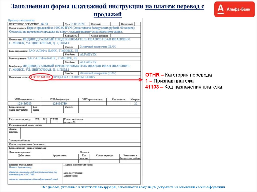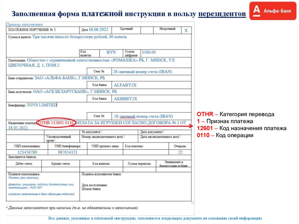 Заполненная форма платежной инструкции в пользу нерезидентовOTHR – Категория перевода