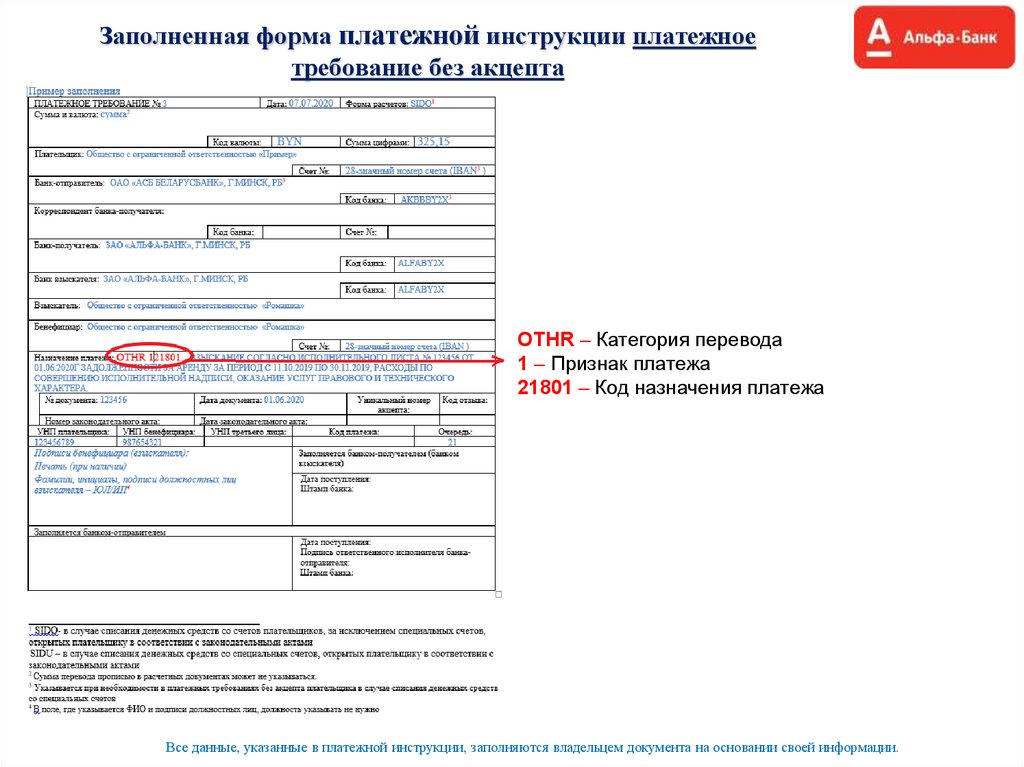 Заполненная форма платежной инструкции платежноетребование без акцепта