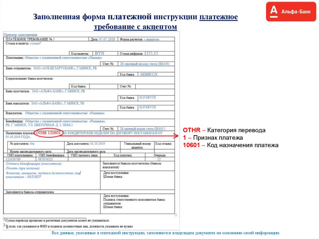 Заполненная форма платежной инструкции платежноетребование с акцептом