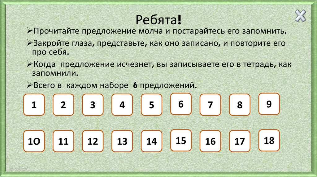 Ребята!Прочитайте предложение молча и постарайтесь его запомнить.