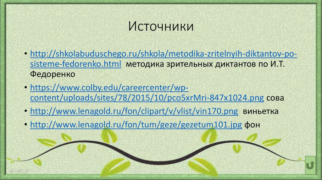 Источники• http://shkolabuduschego.ru/shkola/metodika-zritelnyih-diktantov-posisteme-fedorenko.html методика зрительных диктантов по И.Т.