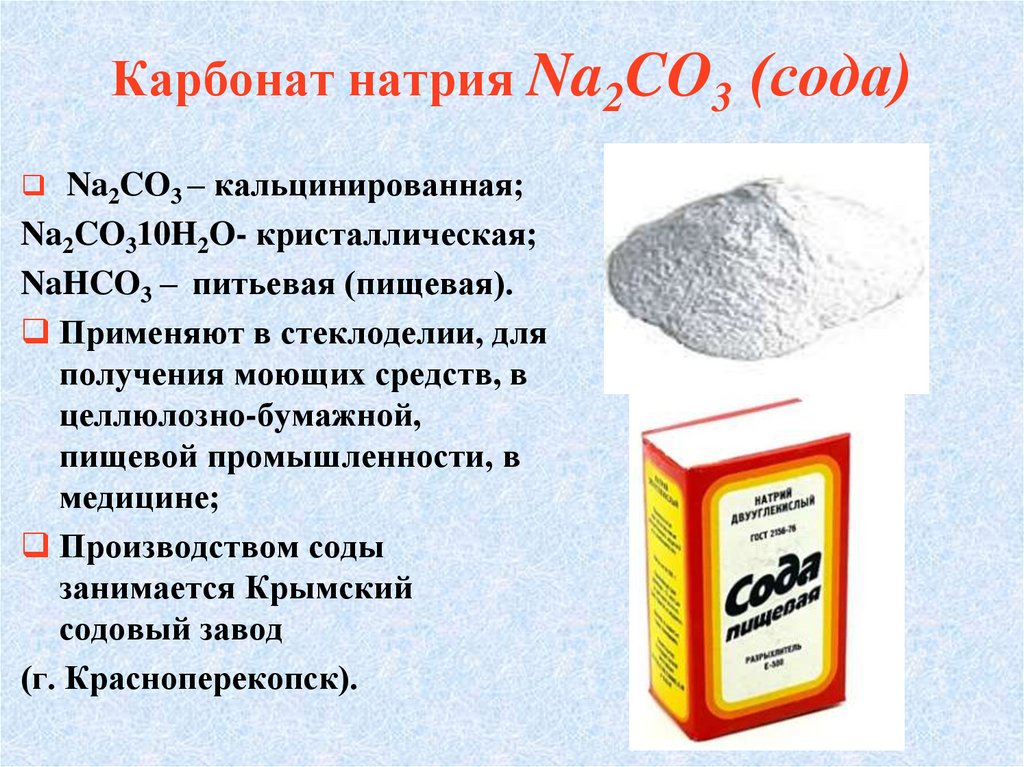 Карбонат натрия Na2CO3 (сода)Na2CO3 – кальцинированная;
