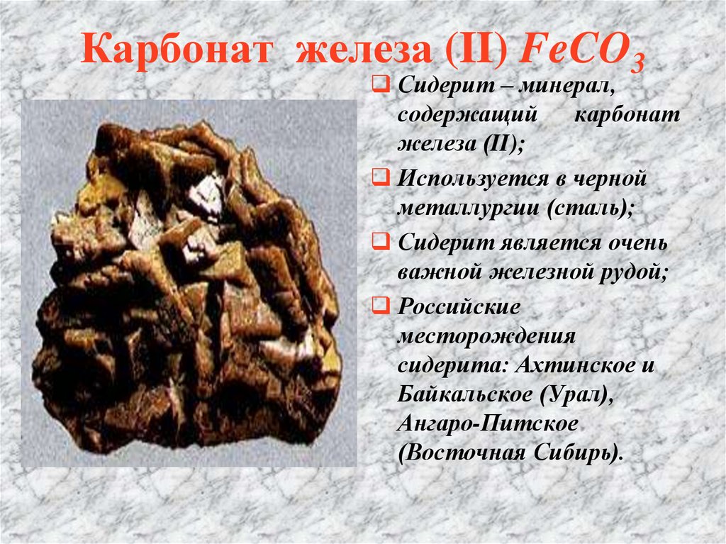 Карбонат железа (II) FeCO3Сидерит – минерал,