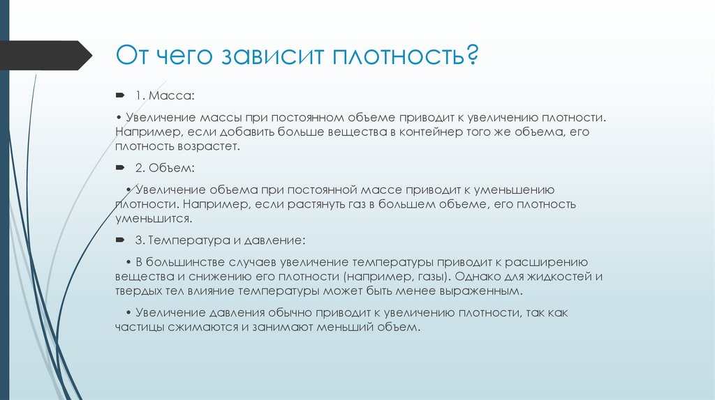 • Увеличение массы при постоянном объеме приводит к увеличению плотности.