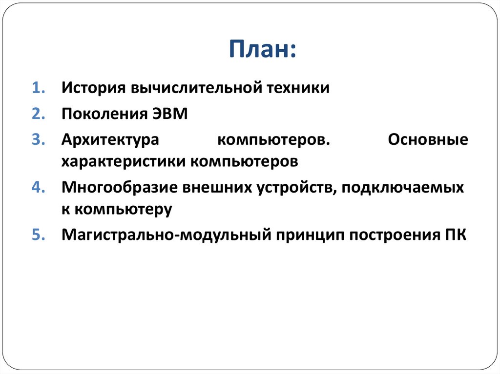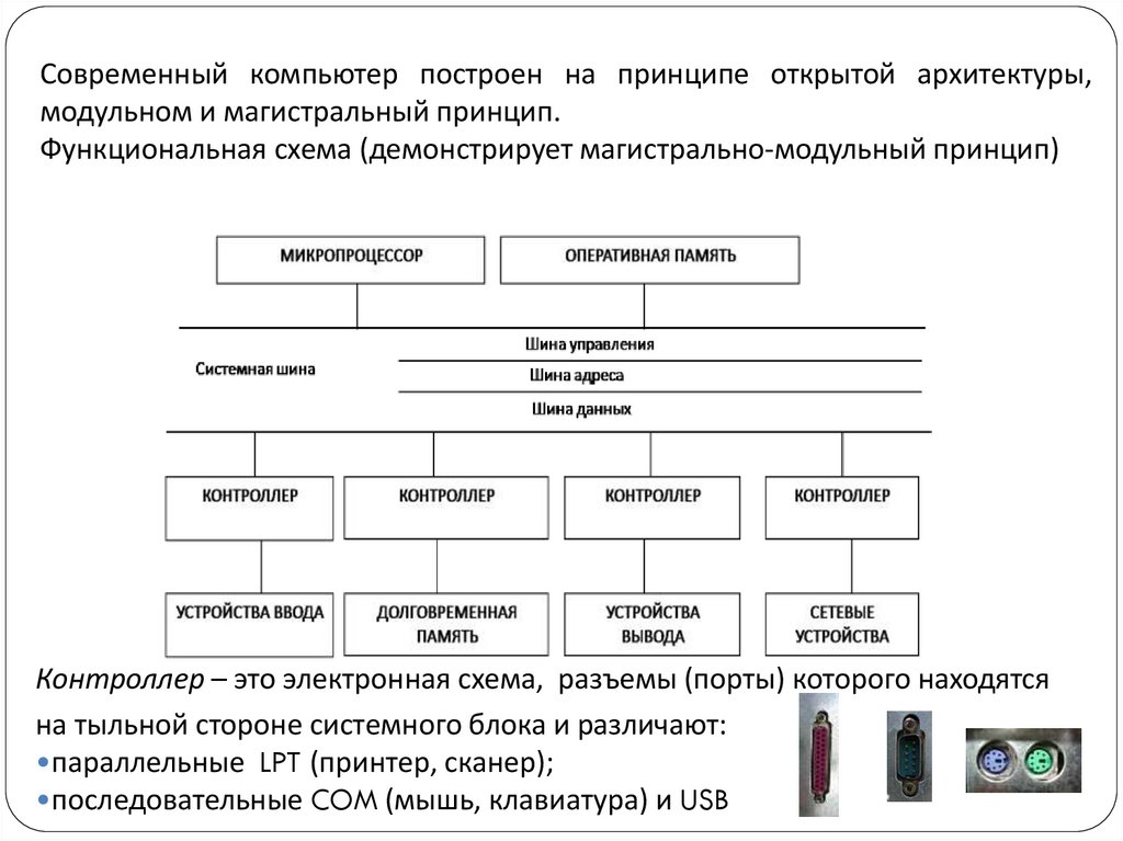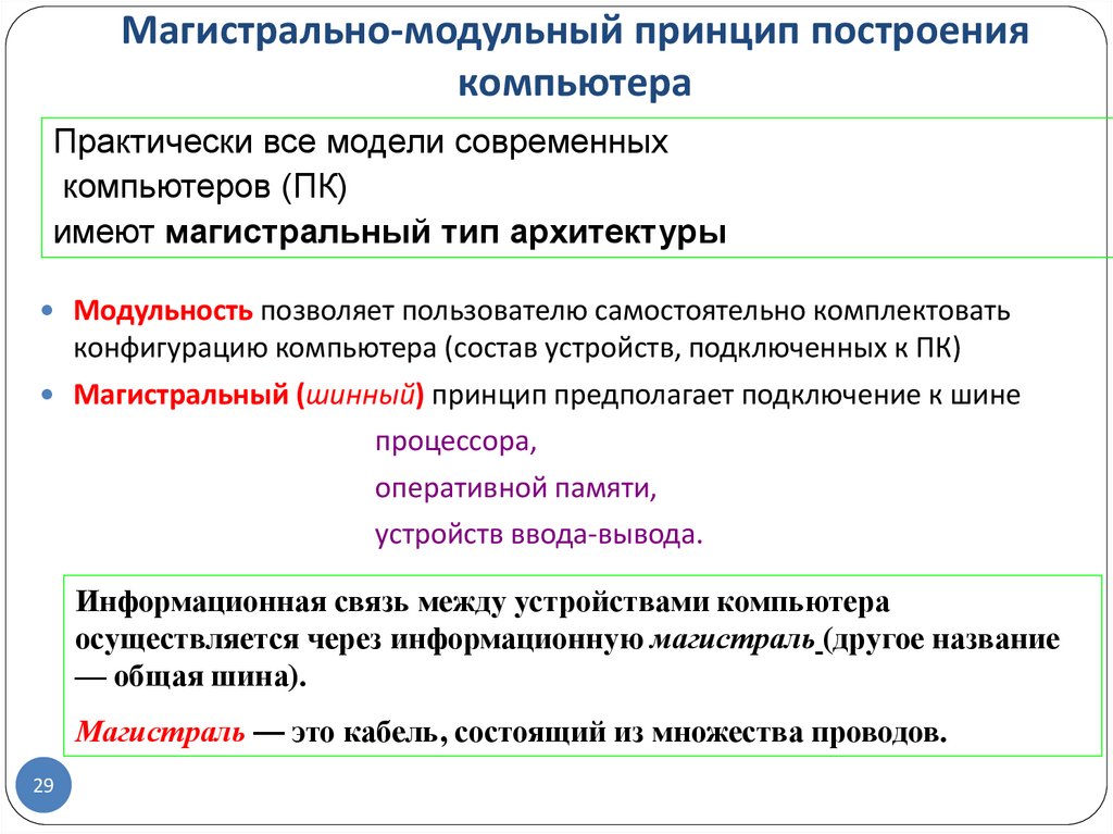 Современный компьютер построен на принципе открытой архитектуры,модульном и магистральный принцип.