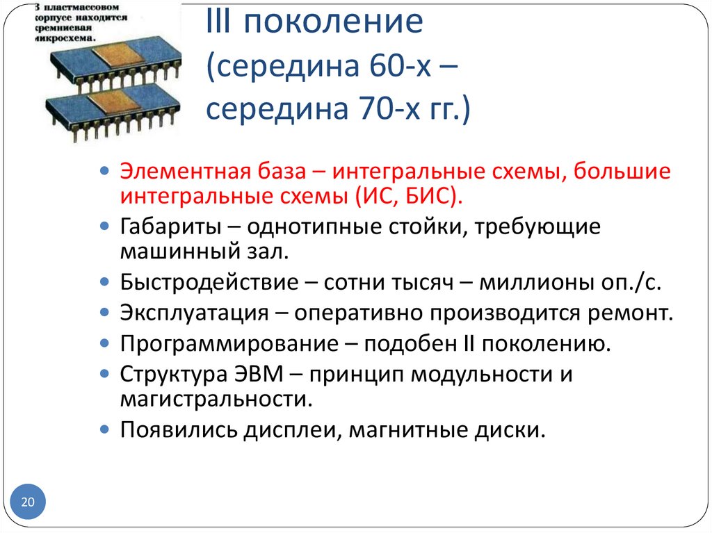 Элементная база – интегральные схемы, большиеинтегральные схемы (ИС, БИС).