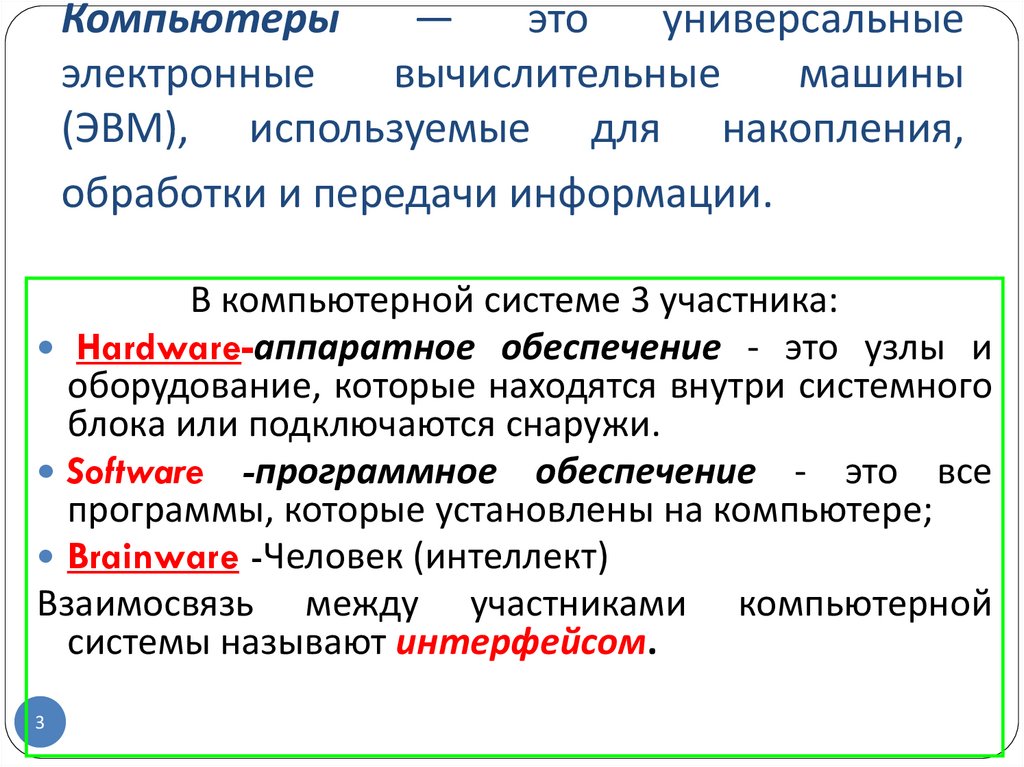 3. Компьютеры — это универсальные электронные вычислительные машины (ЭВМ), используемые для накопления, обработки и передачи