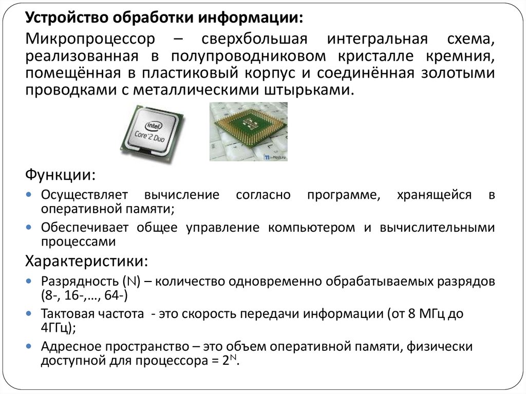 Устройство обработки информации:Микропроцессор – сверхбольшая интегральная схема,
