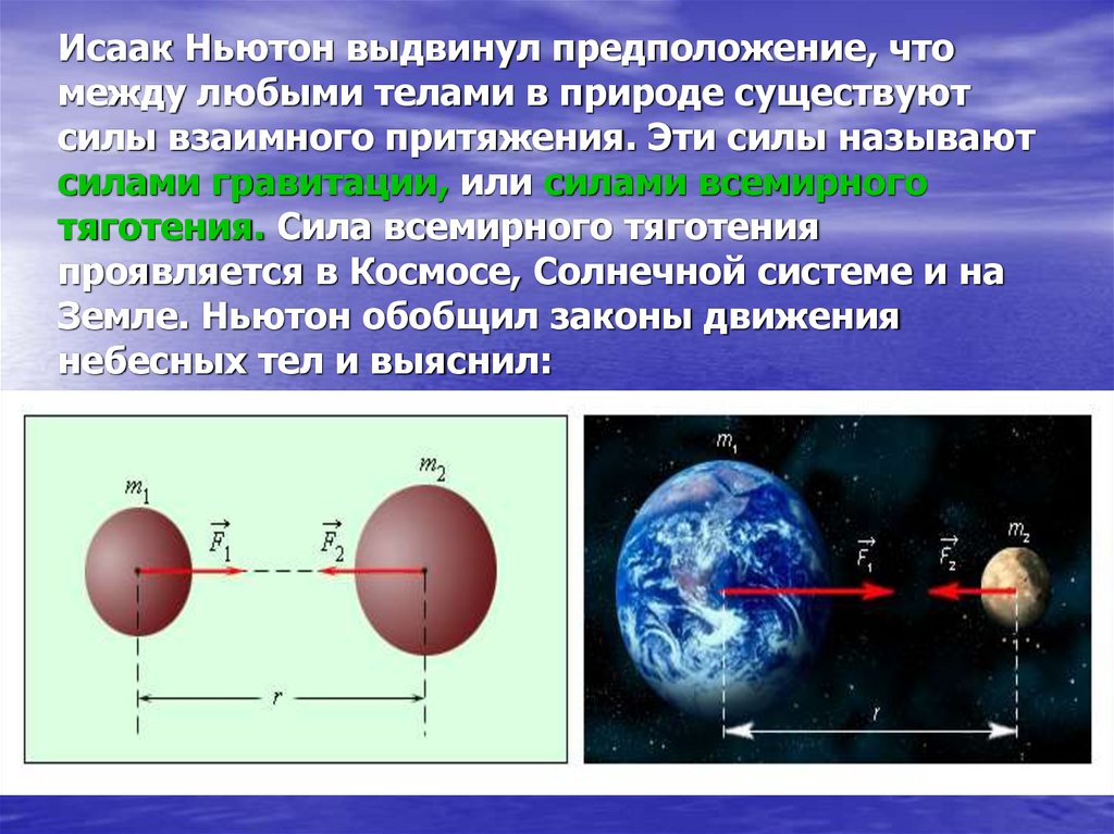 Исаак Ньютон выдвинул предположение, чтомежду любыми телами в природе существуют