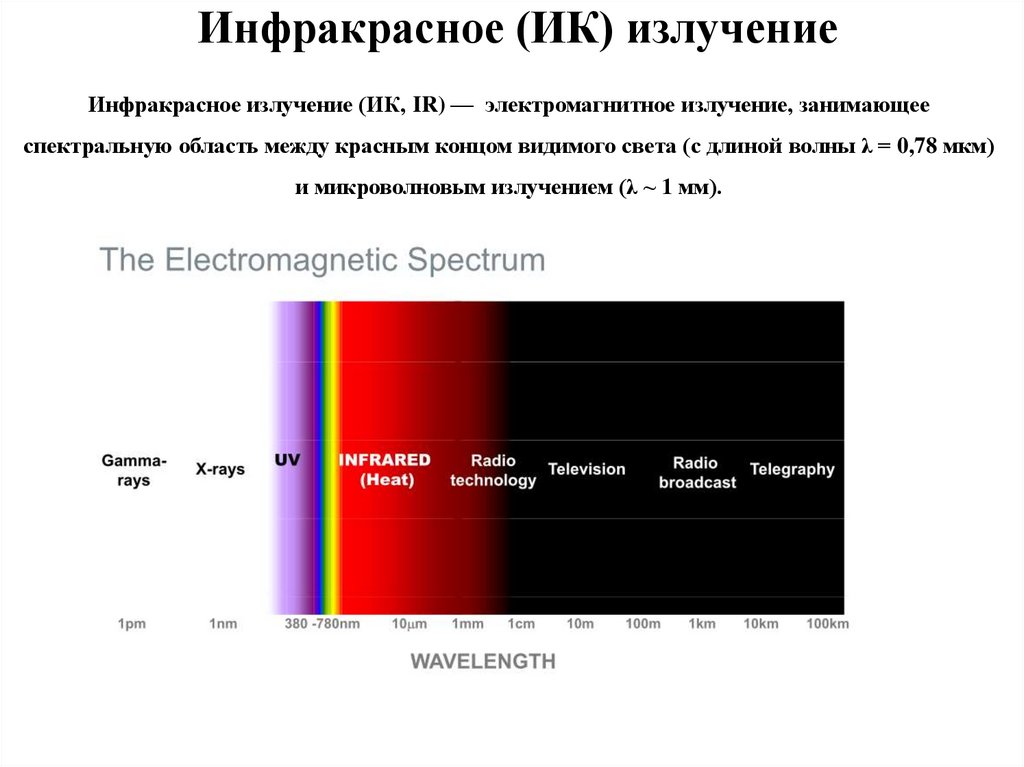 Инфракрасное (ИК) излучениеИнфракрасное излучение (ИК, IR) — электромагнитное излучение, занимающее