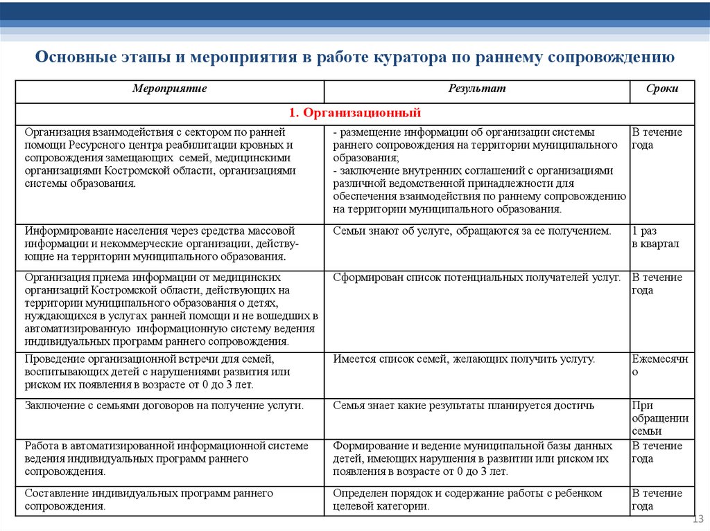 Раннее сопровождение (услуги по раннему сопровождению)- комплексмероприятий, осуществляемый куратором по РС, направленный на