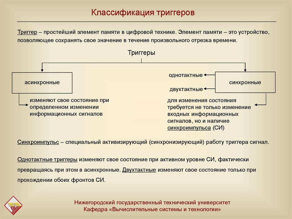 Классификация триггеровТриггер – простейший элемент памяти в цифровой технике. Элемент памяти – это устройство,