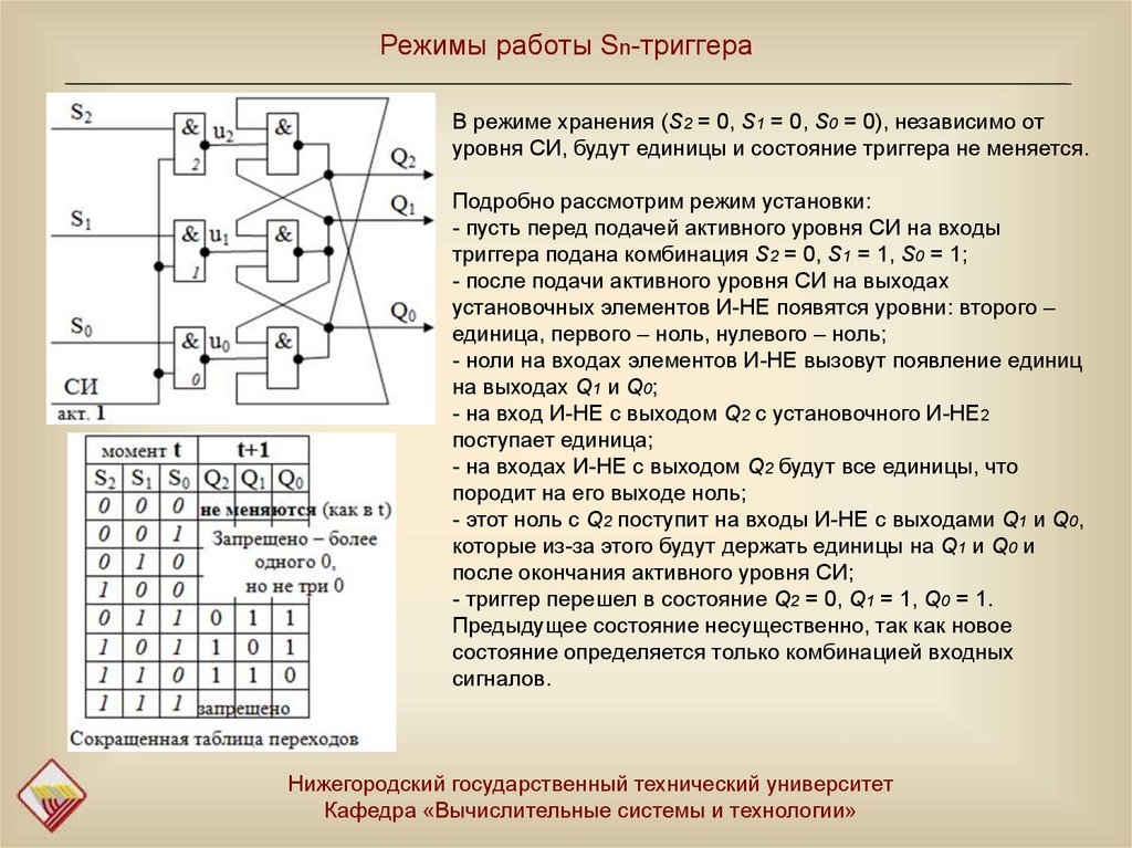 Режимы работы Sn-триггераВ режиме хранения (S2 = 0, S1 = 0, S0 = 0), независимо от