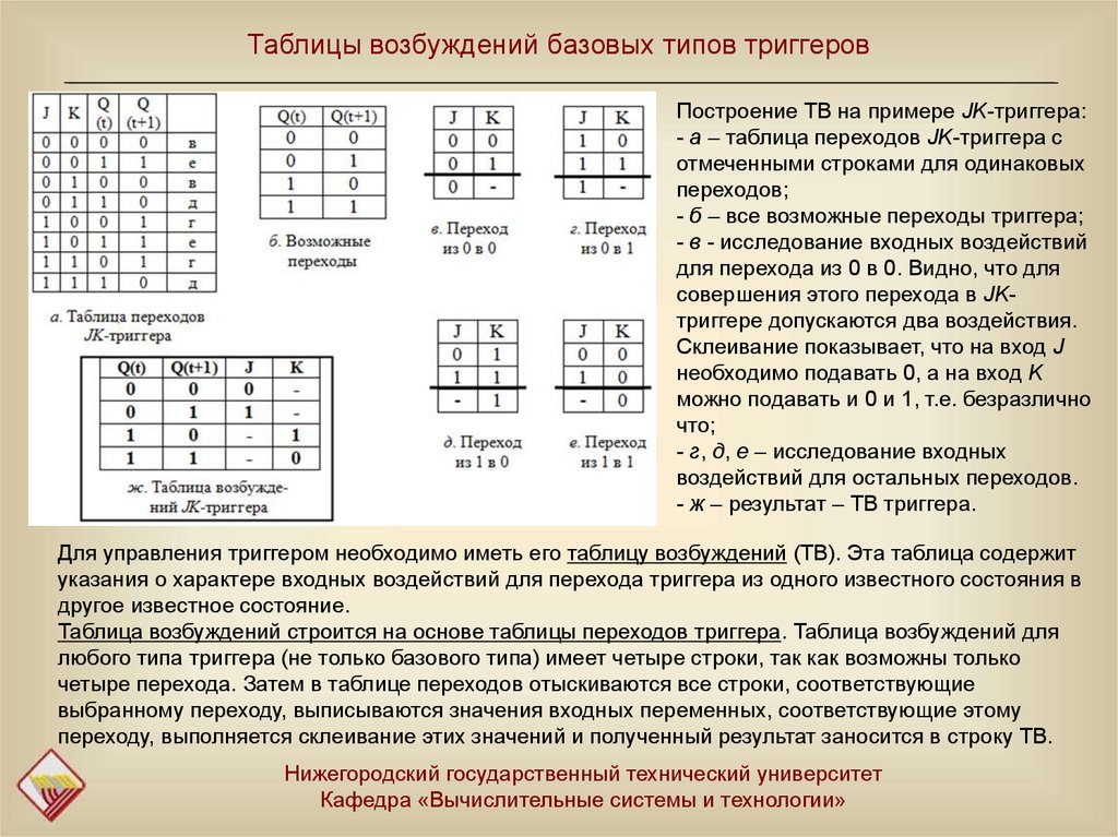 Таблицы возбуждений базовых типов триггеровПостроение ТВ на примере JK-триггера: