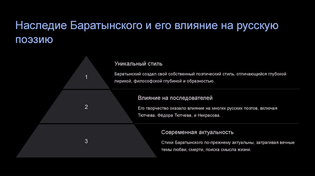 Баратынский создал свой собственный поэтический стиль, отличающийся глубокой