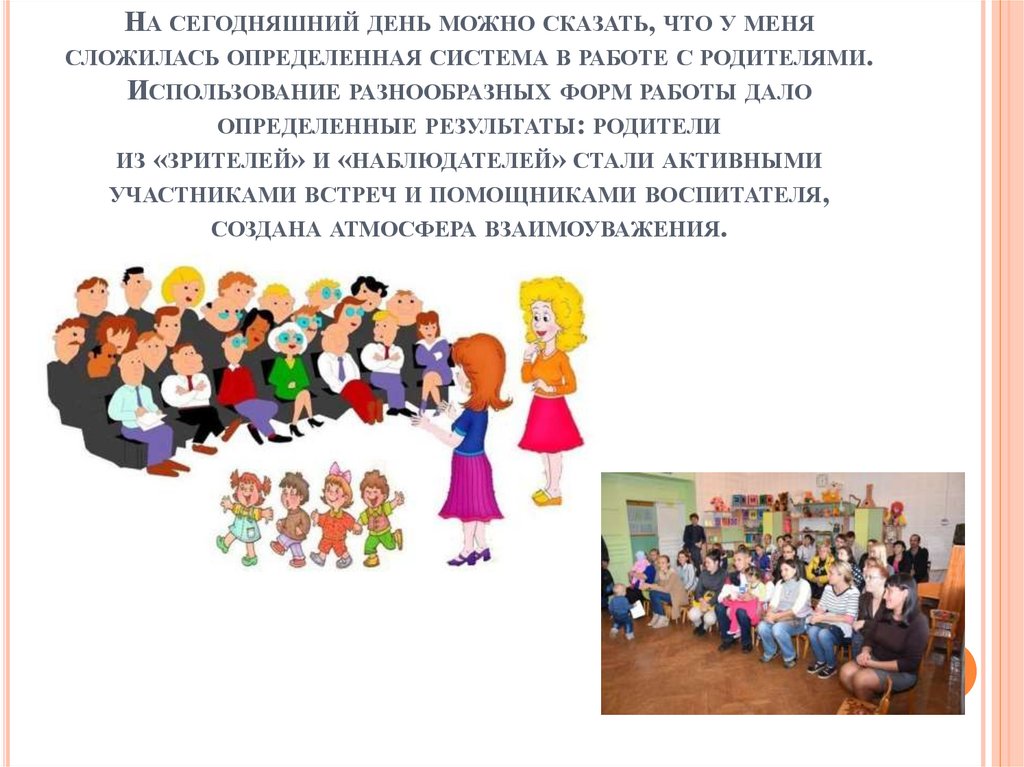 НА СЕГОДНЯШНИЙ ДЕНЬ МОЖНО СКАЗАТЬ, ЧТО У МЕНЯСЛОЖИЛАСЬ ОПРЕДЕЛЕННАЯ СИСТЕМА В РАБОТЕ С РОДИТЕЛЯМИ.